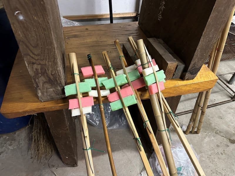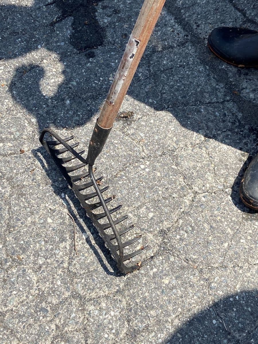 レーキという道具を使って枯草に点火した火を横や下方向に導いて火を広めていきます。