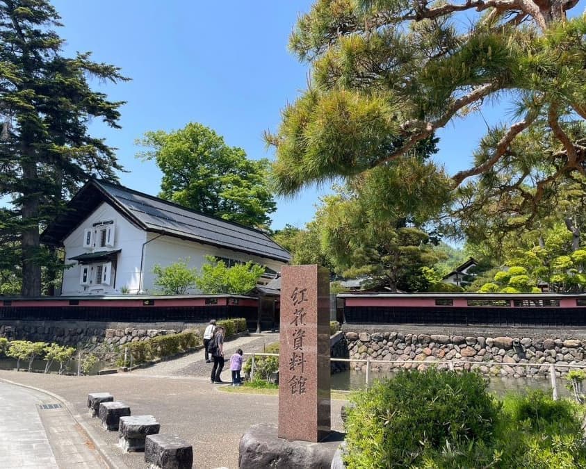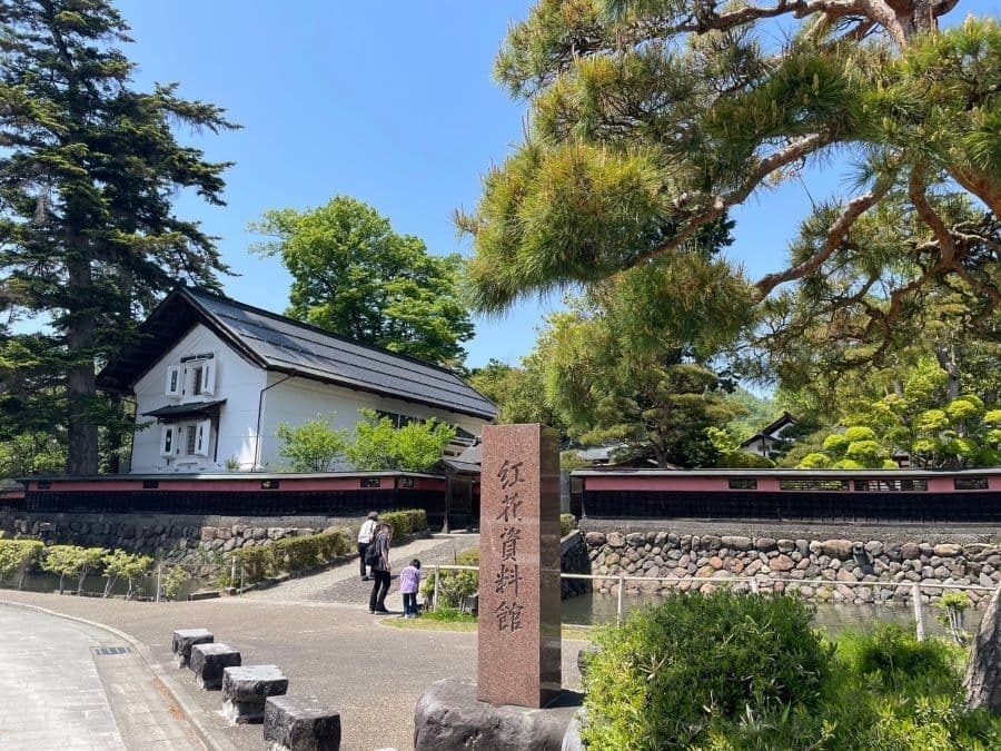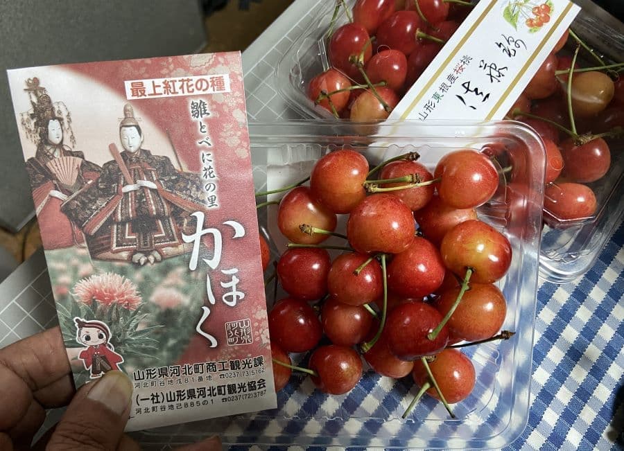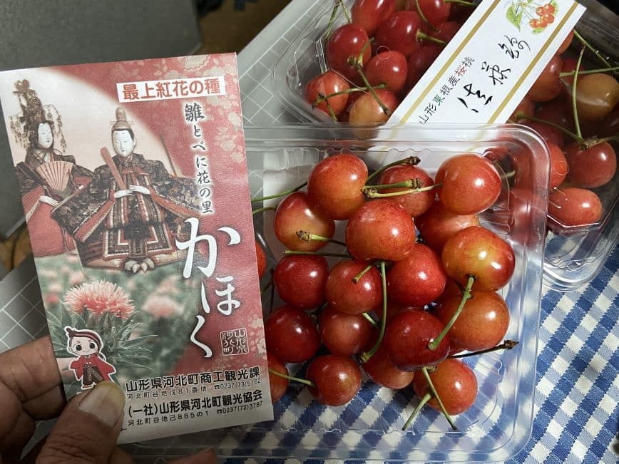 右写真は資料館でいただいた紅花の種と、先輩から届いた河北町のお隣の東根の佐藤錦。5月に訪れた際に見かけたサクランボの栽培風景が目に浮かびます。