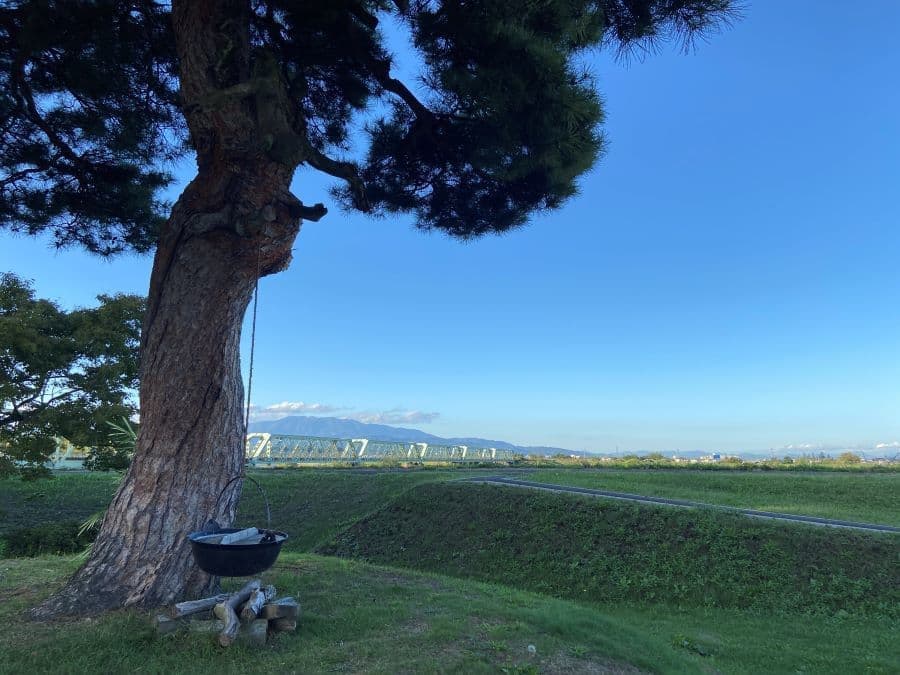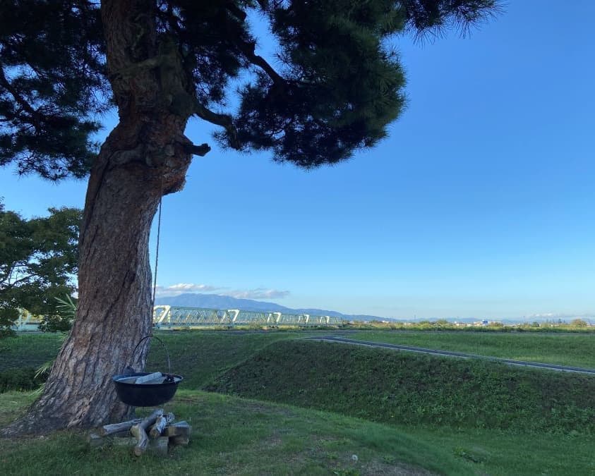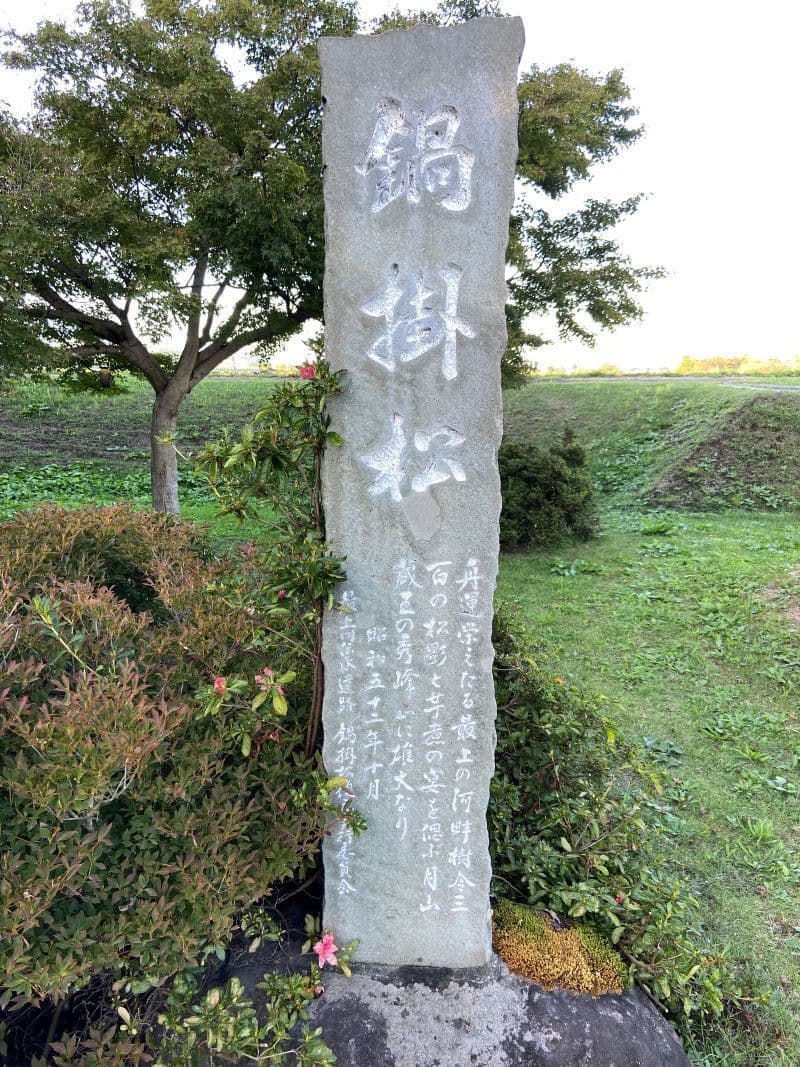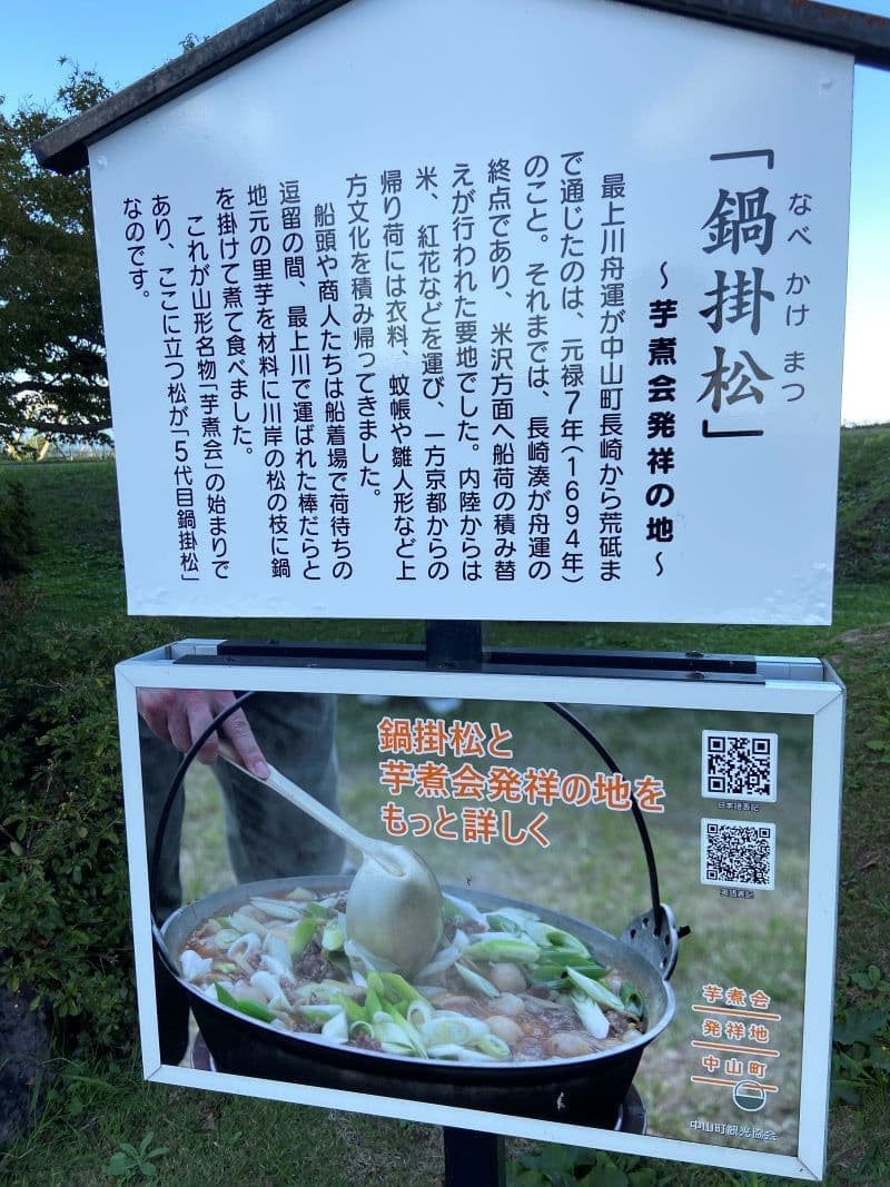 現在5代目となる芋煮会の鍋をつるしたという「鍋掛松」が、船頭たちの休憩場所だったといわれる「ひまわり温泉ゆ・ら・ら」の敷地内(最上川の堤防上)にありました。