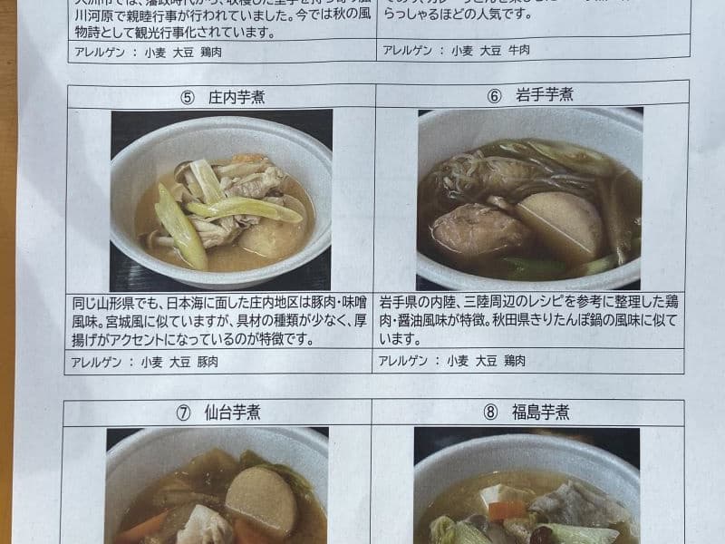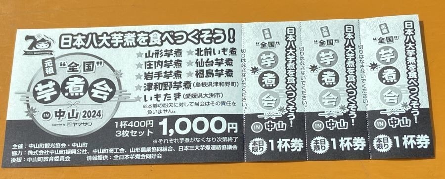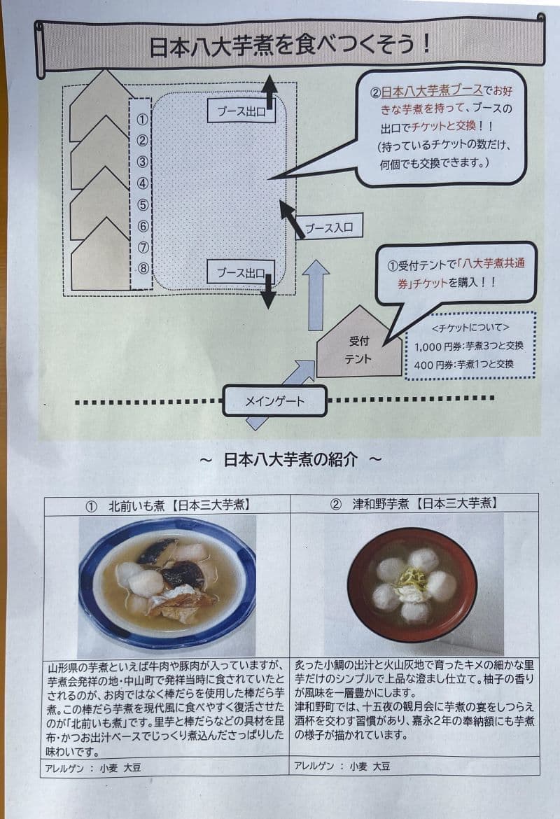 3食千円のチケットを難なく手にし8つ、山形芋煮(山形県村山地方)、北前いも煮(山形県中山町)、庄内芋煮(山形県庄内地方)、仙台芋煮(宮城県)、岩手芋煮(岩手県)、福島芋煮(福島県)、津和野芋煮(島根県津和野町)、いもたき(愛媛県大洲市)からどれを3つ選ぶか人生の岐路のような:選択を迫られます。ちなみに北前いも煮、津和野芋煮、いもたきは日本三大芋煮に数えられるそうです。