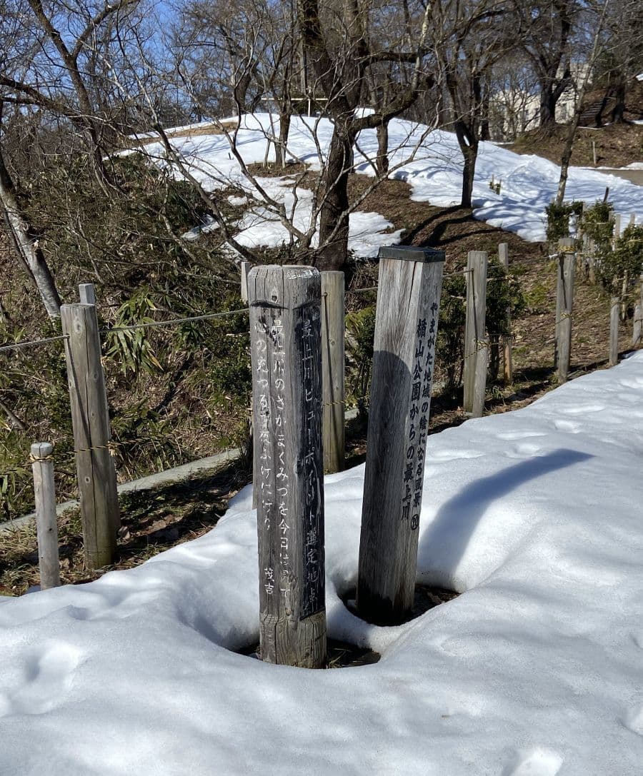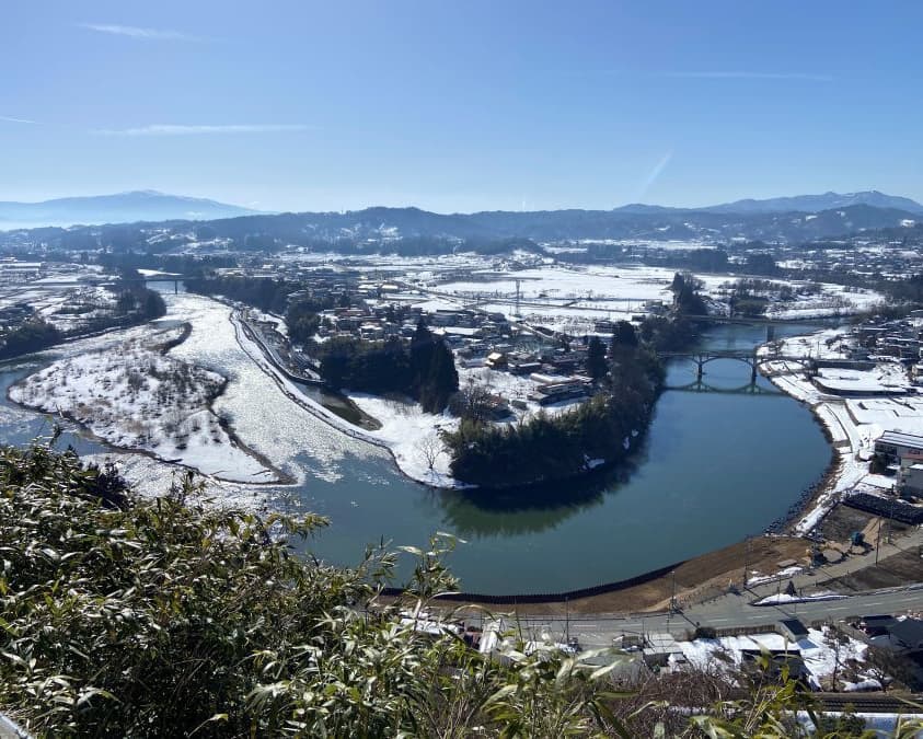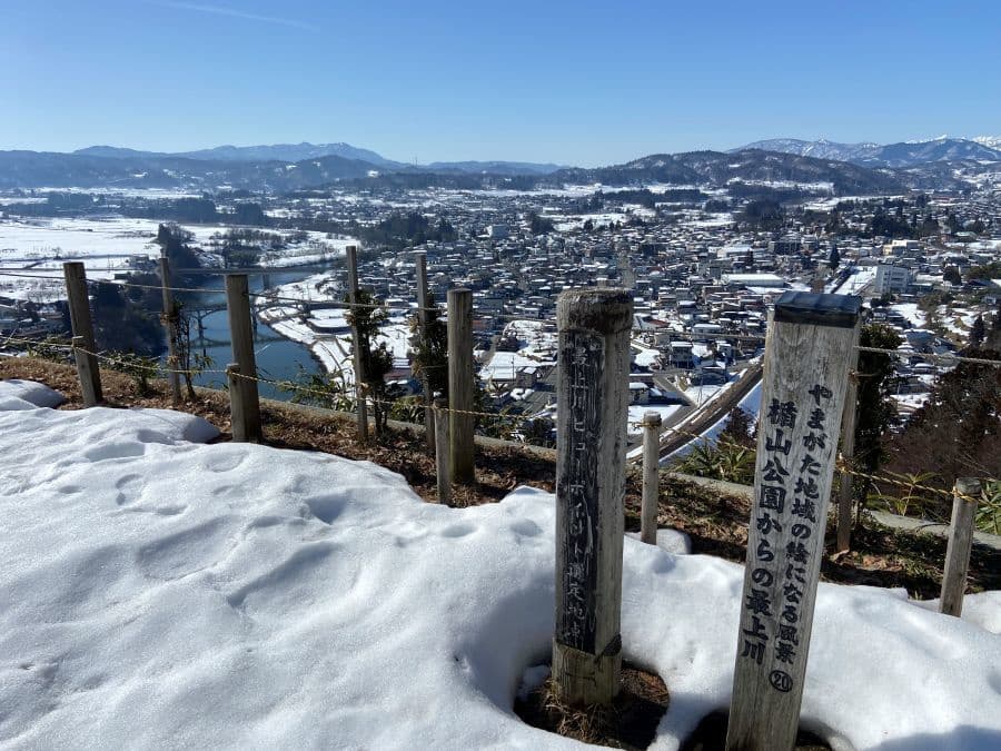 山形県大江町の楯山公園(左沢楯山城史跡公園)は最上川と左沢の街並み(JR東日本・左沢線も)が一望できるスポット。